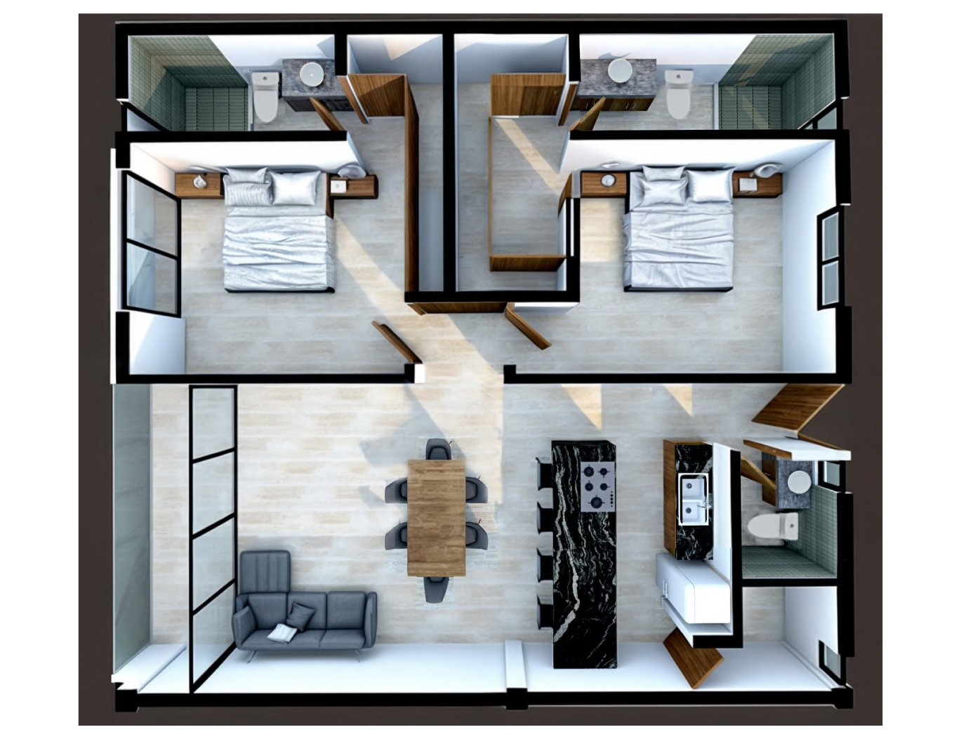 En Zoneto, cada espacio ha sido diseñado pensando en la perfección. Nuestros acabados de lujo reflejan un compromiso con la calidad y el estilo, utilizando materiales de alta gama que combinan durabilidad y elegancia. Desde los pisos hasta los accesorios, cada detalle ha sido cuidadosamente seleccionado para ofrecer una experiencia de vida superior.